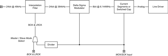 DAC 也是如此。圖 2 顯示了一個高級 DAC 結構圖。此處,需要通過 MCK/SCK 運行內插器,而 MCK/SCK 同時還驅動 △∑ 調制器。如果 MCK/SCK 不是采樣速率的整倍數 (64/128/256/512),則在 △∑ 調制器輸出端可能會出現錯誤數據。