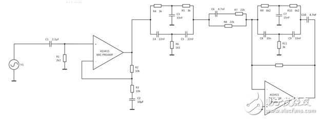 一個(gè)好的ANC耳機(jī)的關(guān)鍵在于濾波器的設(shè)計(jì)。如果濾波器的設(shè)計(jì)不合理,即使再好的ANC芯片也沒(méi)用。濾波器設(shè)計(jì)的目標(biāo)是盡量匹配增益和相位響應(yīng)。在特定頻率匹配得越好,ANC性能也就越好。因?yàn)槭悄M信號(hào)處理,濾波器的仿真通常是通過(guò)spice仿真工具完成的。圖4是一個(gè)spice仿真線路,該線路體現(xiàn)了ANC麥克風(fēng)濾波器的信號(hào)路徑。