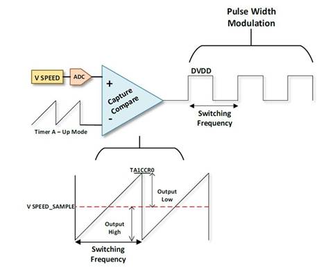 用于控制電機的PWM信號是使用MSP430G2553產生的。通過取樣速度電位器的滑動電壓并將該樣本與Timer_A進行比較MSP430的PWM信號具有不同的占空比和恒定的開關頻率創建。