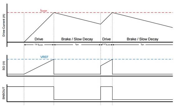 為了控制通過電機的電流,檢測電阻被放置在H橋的底部在兩個低端MOSFET的源極和地之間。一個內部運算放大器然后將DRV8701連接在檢測電阻和地之間,使驅動器可以測量電壓降并通過比例因子AV放大以產生更大的幅度值。該電壓被稱為VSO,并與VREF引腳上設置的電壓進行比較;如果VSO大于或等于VREF時,電橋停止產生柵極信號直到電壓已經降到VREF以下,如果VSO小于VREF,那么橋將繼續產生門電路信號。