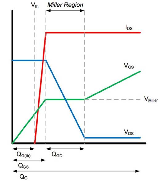 使用DRV8701為兩相逆變器中的MOSFET提供柵極信號可以實現使用IDRIVE設置選擇ISINK和ISOURCE電流?刂频哪繕薎SOURCE和ISINK將調整提供給四個MOSFET的柵極的電流量H橋,并在沒有有源區和飽和區之間達到所需的轉換速率向設備提供過量的電流。如果MOSFET的轉換速率太低,該器件將花費太多的時間在下面的圖所示的米勒地區。