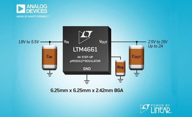 2018 年4月10日Analog Devices (ADI) 宣布推出 Power by Linear™ LTM4661,該器件是一款采用 6.25mm x 6.25mm x 2.42mm BGA 封裝的低功率升壓型 µModule® 穩(wěn)壓器。只需少量的電容器和一個電阻器即可完成設計,而且解決方案的占板面積小于 1cm² (單面 PCB) 或 0.5cm² (雙面 PCB)。LTM4661 內(nèi)置了一個開關(guān) DC/DC 控制器、MOSFET、電感器和支持組件。LTM4661 在 1.8V 至 5.5V 的輸入電源范圍內(nèi)工作,而且在啟動之后可在低至 0.7V 的電壓條件下繼續(xù)運行。輸出電壓可利用單個電阻器設定在 2.5V 至 15V 的范圍內(nèi)。該器件采用小巧扁薄的封裝并具有寬輸入和輸出電壓范圍,因而成為眾多應用的理想選擇,包括光學模塊、電池供電型設備、基于電池的備份系統(tǒng)、用于功率放大器或激光二極管的偏置電壓以及小型 DC 電機。