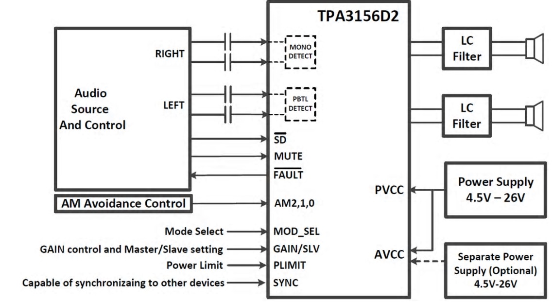 TPA3156D2模擬輸入D類放大器具有低空閑功率損耗,有助于延長藍牙/無線揚聲器和其他電池供電音頻系統的電池使用壽命。TPA3156D2器件的效率非常高,提供2×70W的功率,在雙層PCB上有外部散熱器。該器件集成了一種高效升壓模式,動態減小外部LC濾波器的電流紋波和空閑電流。TPA3156D2高級振蕩器/可編程鎖相環路 (PLL) 電路采用一個多重開關頻率選項來避免AM干擾。在實現此功能的同時,還有一個主器件或從器件選項,這使得多重器件同步成為可能。TPA3156D2器件具有短路保護和過熱保護以及過電壓、欠電壓和直流保護的全面保護,以防止發生故障。將故障報告回處理器,以防止器件在過載情況下受到損壞。