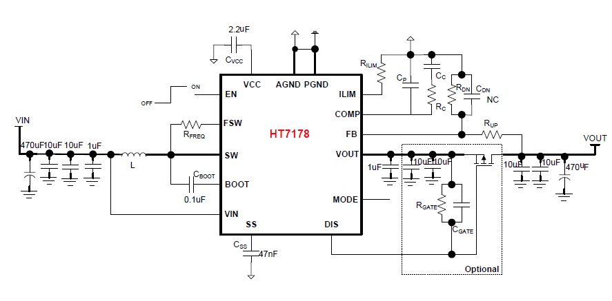 HT7178還支持可編程的軟啟動,以及可調(diào)節(jié)的開關(guān)峰值電流限制。另外,HT7178集成了輸出關(guān)斷功能的柵極驅(qū)動,在SD狀態(tài),可完全斷開輸入電源。此外,該器件還提供有22V輸出過壓保護(hù)、逐周期過流保護(hù)和熱關(guān)斷保護(hù)。