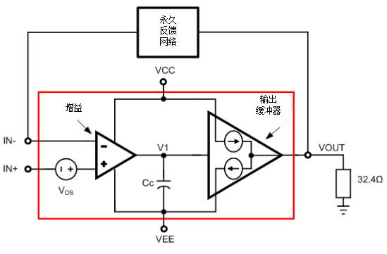 圖1是驅動耳機負載的運算放大器的簡化 。它包括兩個級——一個增益級和一個輸出緩沖器,以及一個補償電容器、Cc和一個補償電壓,Vos。如圖所示,輸出緩沖器是一個單位增益級,能夠吸收電流和提供電流。