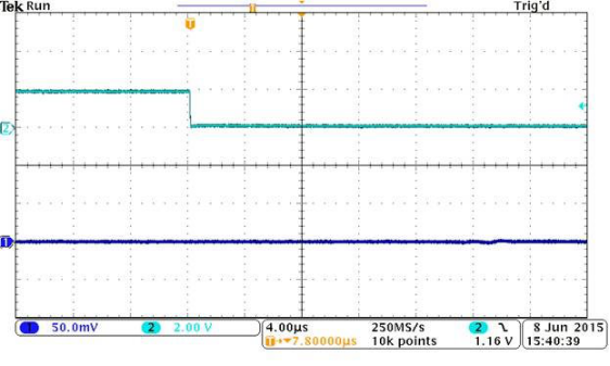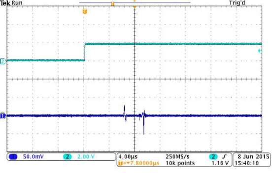 圖3和圖4分別顯示了OPA1622在啟用和禁用期間的性能。只有極小的輸出瞬態會伴隨啟用或禁用的過程。輸出瞬態發生的時間極短,因此使用耳機時聽到的可能性不大。