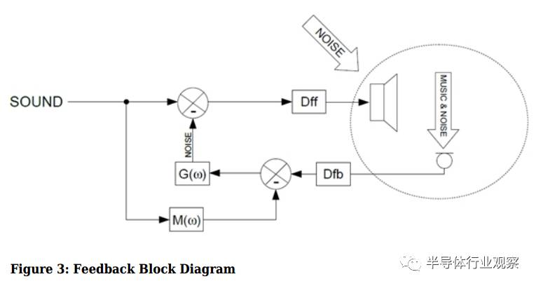 在反饋有源噪聲消除方案中,麥克風采樣的不是直接的環境噪聲,而是耳機輸出處的聲音,顯然這里的聲音包括了音樂和環境噪聲。那么如何選擇性地抵消掉噪聲但是保留音樂呢?就需要把這里采樣到的聲音減去音樂,這樣剩下的信號就全是噪聲了;然后再根據這個噪聲去產生噪聲抵消信號。這樣做的話,就不會有風噪問題。然而,這里又有一個新問題,就是反饋系統通常帶寬會遠小于前饋系統,因此使用反饋模式的有源噪聲消除對于高頻噪聲的抵消作用有限。
