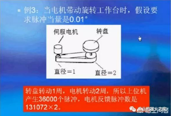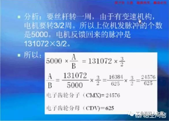 上面例子的補充說明:上位機脈沖個數5000,是通過,絲杠螺距為5mm,脈沖當量要求是0.001mm,所以脈沖個數是5/0.001=5000。編碼器反饋脈沖是131072一轉(伺服電機),但由于變速機構,故3/2。