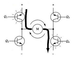 當三極管Q1和Q4導通時,電流將從左至右流過電機,從而驅動電機按特定方向轉動(電機周圍的箭頭指示為順時針方向)。