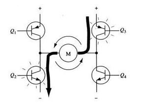 當三極管Q2和Q3導通時,電流將從右至左流過電機,從而驅動電機沿另一方向轉動(電機周圍的箭頭表示為逆時針方向)。