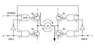 采用以上方法,電機的運轉就只需要用三個信號控制:兩個方向信號和一個使能信號。如果DIR-L信號為0,DIR-R信號為1,并且使能信號是1,那么 三極管Q1和Q4導通,電流從左至右流經電機(如圖5所示);如果DIR-L信號變為1,而DIR-R信號變為0,那么Q2和Q3將導通,電流則反向流過電機。