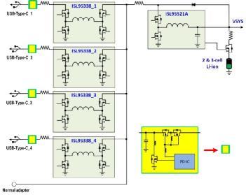 圖1. Intersil電池充電器架構 – 雙USB-C端口,采用兩個降壓-升壓穩壓器和一個降壓充電器