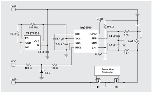 圖3顯示了具有bq26500的支持兩節鋰離子電池的典型應用電路。一個可調電壓調節器被添加至系統中,以實現多電池支持。電池電量監測計的BAT引腳被連接至底部電池的正極,以實現電池組的調節電壓測量。