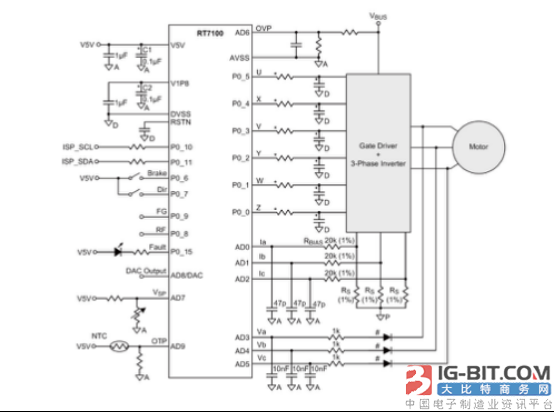 RT7100 是針對 3 相 PMSM/BLDC 電機驅動應用的專用控制器,配合門極驅動器和 MOSFET/IGBT 開關即可構成完整的電機驅動系統。它以 ARM Cortex-M0 處理器為核心,集成了 MTP ROM、SRAM 存儲器和 ADC、DAC、SVPWM、看門狗、電流檢測器、通訊接口等必要外設,立锜已經為之配備了包含電流環控制的正弦 FOC 控制軟件并通過了 UL 安全認證,擁有過流、過壓、欠壓和電機堵轉保護功能,支持睡眠節能模式,可根據用戶的需求對應用軟件進行修改定制、優化處理,為風扇、泵浦類應用提供有針對性、成本低廉、易于實施、安全可靠的解決方案。