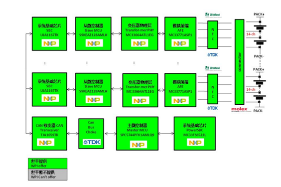 圖示1-基于NXP產品的BMS動力電池管理系統(tǒng)解決方案的系統(tǒng)方案圖