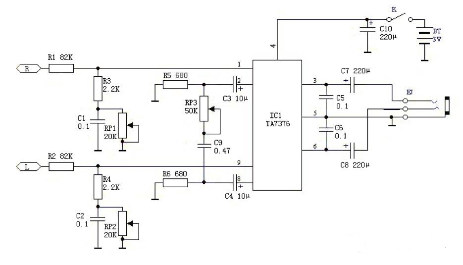 由電阻電容組成的低頻增強電路。利用功率放大器IC的反饋輸入,組成立體聲反相合成電路。利用功率放大器IC組成頭戴耳機的驅動電路。從輸入端IC之間的電阻電容起到增強低頻特性的作用,因為加有電位器,低頻部分的增強量可在0--10倍之間連續可調。立體聲反相合成電路IC 2腳和8腳的直流耦合電容之后,由0.47μF和50K的電位器組成。在此電路中,把立體聲的廣場效果成分中的高音部分左右分別反相后合成,起到增強效果的作用。用東芝TA7376P推動頭戴式耳機。這種IC內藏兩個通道,外接元件少,可在低電壓下工作。負載阻抗較低時,可重放出動人效果的低頻聲音 。電源若改用5#電池,用四只串聯,電壓為6V,可直接驅動高輸出的揚聲器。若將三個200μF/10V的電容增加到1000μF左右,可獲得更好的效果。
