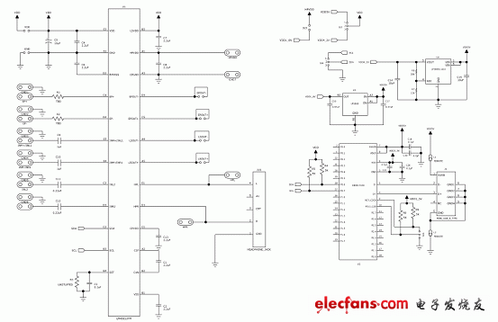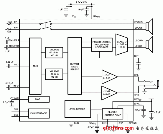| NS 公司的LM49153是全集成音頻子系統,包括高效25mW的G類耳機放大器(THD+N ≤ 1%)和高效的1.35W D類揚聲器放大器(RL = 8Ω, THD+N < 1%),通過I2C進行音量,模式選擇和關斷控制,主要用在手機和智能手機。本文介紹了LM49153主要指標,主要特性,典型音頻放大器應用電路以及演示板電路圖和材料清單,元件布局圖。