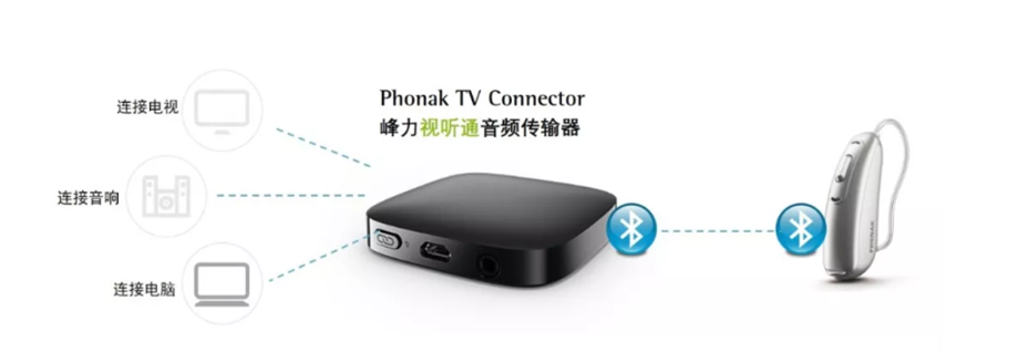 神通系列助聽器可以與視聽通音頻傳輸器 (Phonak TV Connector) 實現藍牙配對,將高清優質的音頻從電視機或者立體聲音響上,直接無線傳輸到助聽器,使用者可以與家人朋友一起收聽,不必擔心音量過大影響他人。視聽通音頻傳輸器搭載 AirStream 技術,傳輸無延遲、更清晰,同時支持立體聲音頻輸出。