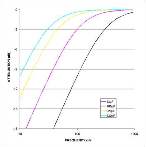 為實現揚聲器與直流偏壓的隔離,通常需要使用隔直電容。這一電容與大多數情況下連接的阻性負載一起構成了高通濾波器。由于典型的耳機負載等效為一個32Ω的電阻,電容容值必須足夠大,以避免濾除音頻帶寬中的有用部分。假如有效帶寬下限為20Hz,必須采用最小250µF的電容,以確保在20Hz處的衰減最大不超過3dB。如果采用16Ω的耳機,則最小需要500µF的隔直電容。雖然有些系統有足夠的空間可以采用這類大尺寸的廉價鋁電解電容,但大多數便攜式設備還是沒有足夠的空間容納這么大電容。對于后者,必須使用比較昂貴的鉭電容以節省空間,但即便是采用這類電容仍需占用很大的電路板空間。因此,經常使用小電容以節省空間和成本,但這是以犧牲20Hz的平坦頻率響應為代價。圖2給出了采用不同標準尺寸的電容所對應的頻率響應。