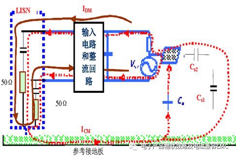 傳導干擾共模與差模信號的電流路徑分析。