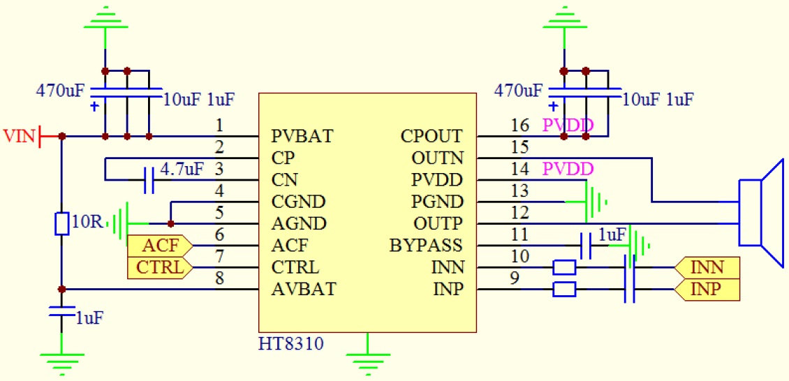 HT8310內(nèi)部集成免濾波器數(shù)字調(diào)制技術(shù),能夠 直接驅(qū)動(dòng)揚(yáng)聲器,并最大程度減小脈沖輸出信號(hào)的失 真和噪音。輸出無需濾波網(wǎng)絡(luò),極少的外部元器件節(jié)省了系統(tǒng)空間和成本,是便攜式應(yīng)用的理想選擇。