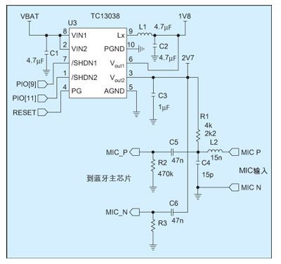 MOSFET,采用2MHz的開關頻率,轉換效率達到92%以上。高開關頻率和PWM/PFM自動切換技術可使工程師選擇低至2.2μH的表貼電感和陶瓷電容,即可滿足濾波和藍牙芯片對紋波的要求。TC1303內集成的LDO可提供300mA的輸出電流,且只有137mV電壓差。為了進一步減小DC/DC開關噪聲對電路設計的影響,在芯片設計時將LDO的電源地引腳和DC/DC電源地引腳分開,保證了LDO輸出可以給I/O部分和麥克風提供“干凈”的電壓。