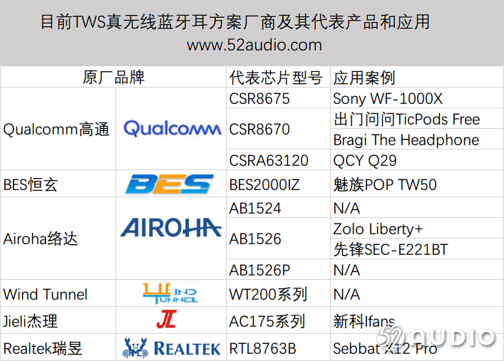 | 長時間深耕藍牙耳機領域,經過大量的拆解和評測之后不完全統計,目前國內制造藍牙耳機的廠商已有數百家,其中還有眾多與藍牙耳機產品相關的硬件等配套部件或技術方案的廠商活躍在一線陣地。直到我愛音頻網作此篇統計的時候,市場上目前呈現出“CBA”的格局,其分別為C(CSR高通)、B(BES恒玄)、A(Airoha絡達)。我愛音頻網對目前市面上常見的以及即將推出的TWS真無線藍牙耳機方案作了簡單統計,請查看下表。