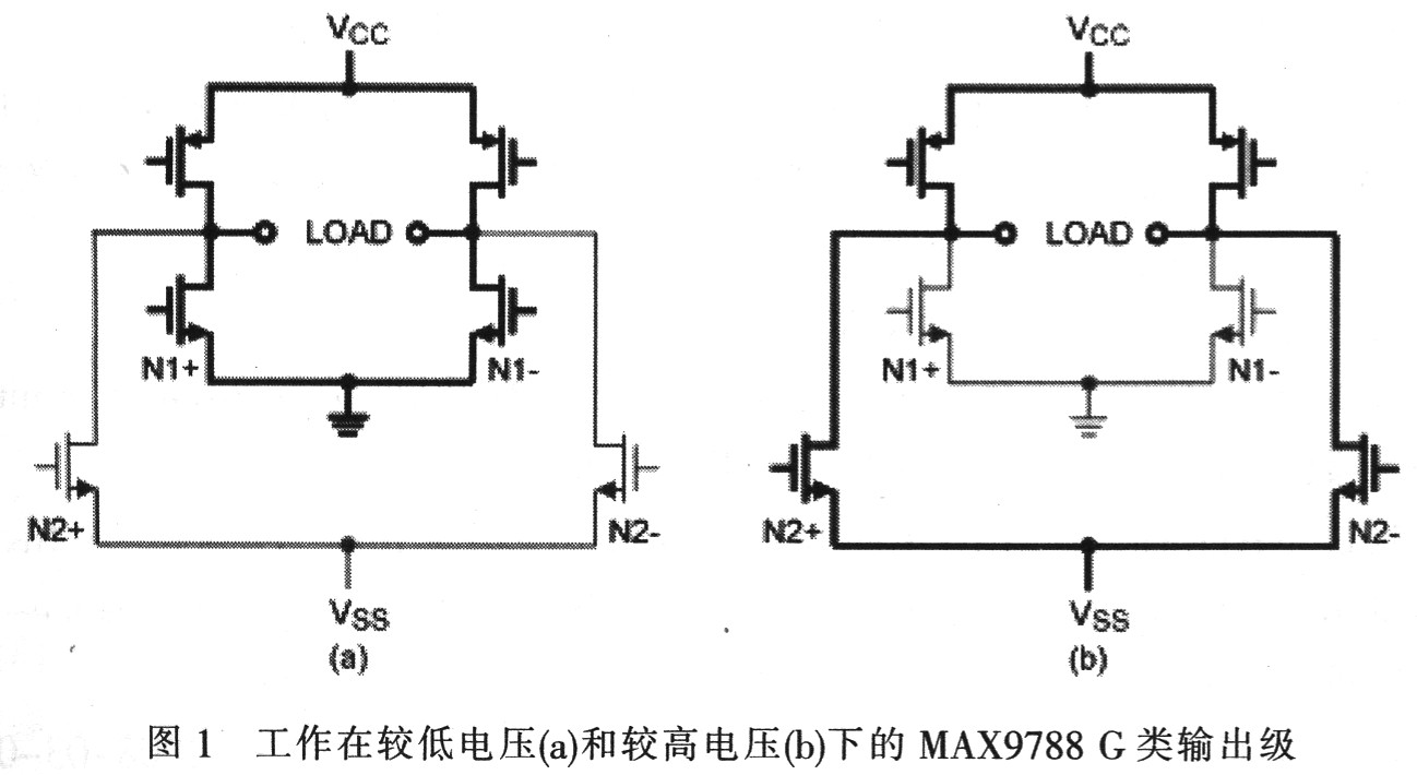 G類放大器MAX9730和MAX9788則以獨特的方式利用G類技術,它們由電荷泵產生負壓,而非高、低正電源。當放大器產生較小的輸出信號時,放大器由電池電壓和地作為供電電源。這種模式下,器件的工作方式與常見的5 V AB類放大器(圖1a)類似。當輸出信號超出電源電壓時,放大器選擇電池電壓和負電荷泵輸出供電(圖1b)。由此,G類放大器的輸出信號遠遠高于傳統放大器的信號。