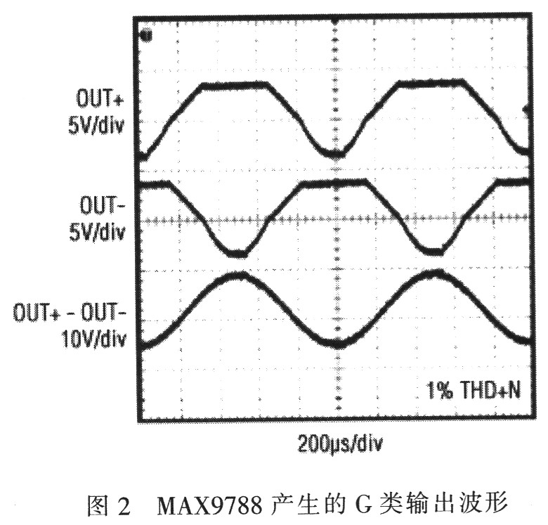 MAX9730和MAX9788可以確保在兩電源之間切換不會產生音頻雜音。當輸出信號達到VCC和GND供電所允許的極限時,負電源被自動連接至輸出級。這樣,輸出信號不會在負擺幅側出現削頂,仍箝位于其正擺幅。為了校正這一點,放大器給負極性輸出增加額外的校正信號,如圖2所示。分別觀察正、負輸出時,正半周波形被明顯削頂,而負半周存在明顯失真。盡管這些信號出現了嚴重的失真,但卻被嚴格控制,充分利用了該架構的優勢。施加到負載上的實際輸出信號沒有失真。
