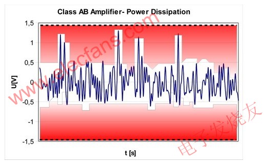 上述音頻放大器的功率數值為峰值功率值。實際上,需要這個最大電源電壓的時間極短;音頻信號具有很寬的動態范圍。大部分的時間,輸出電壓均低于0.5V,而放大器的電源電壓卻可達到1.5V。輸出電壓和電源電壓之間的差異來自內部放大器晶體管所消耗的部分,這是電力損耗的主要原因。