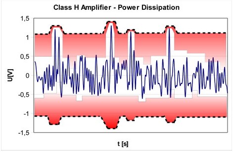 但是,這并不能掩蓋除了在高輸出電壓水平以外,晶體管仍然會消耗大量電能的事實。要解決這個問題,需要改變放大器本身的電源配置,這就是開發G類和H類放大器的原因。