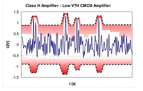 相對于G類放大器,H類放大器可根據輸出信號的要求平穩地調節輸出電壓。因此,不同于G類放大器,H類放大器不受限于兩或三種固定輸出電壓。它能將來自降壓轉換器的最低允許電源電壓平穩轉換為任意一種離散輸出電壓。