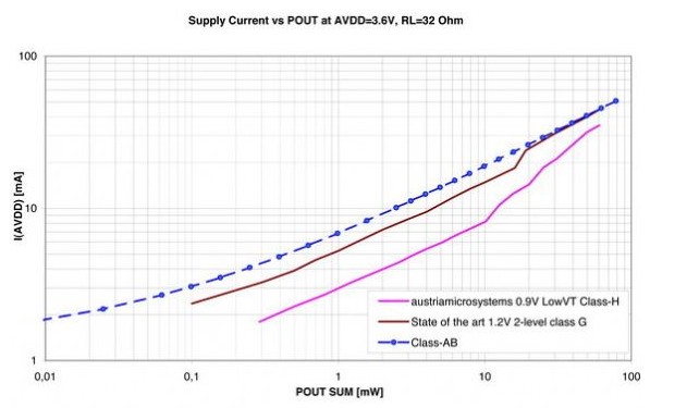 手持設備使用的音頻放大器通常會驅動一個16歐或32歐的阻抗,這兩種阻抗往往會消耗設備的大部分功率預算。這意味著任何有關功率放大器效率的改善,都能顯著提升整個設備的效率及電池使用時間。