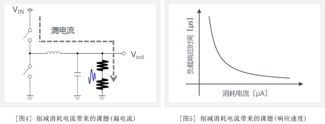 “對元件漏電流的影響增加”是指組成電源IC的部件中MOS(Metal Oxide Semiconductor Field Effect Transistor)晶體管相關的問題。該晶體管即使在OFF狀態下也會流過一定的漏電流。該漏電流產生于內部電路或輸出段。例如,以流入反饋電阻的漏電流為例(圖4),如果是之前的電阻值,則相對于輸出電壓產生的穩態電流(=輸出電壓÷反饋電阻)漏電流十分小,因此可以忽略;但電阻增大后,穩態電流會變小,將無法再忽略漏電流的影響。