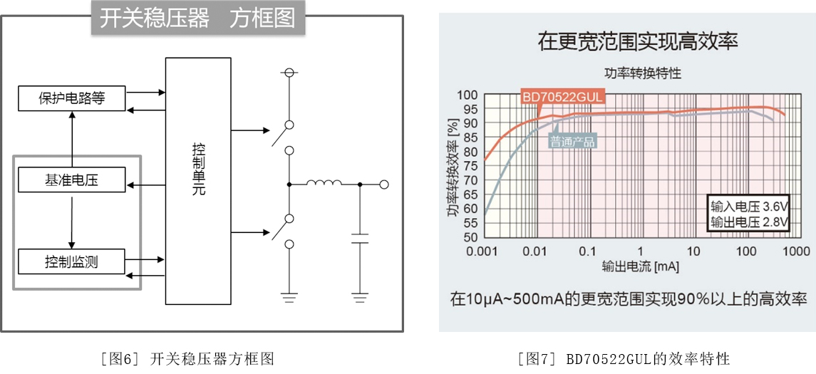 Nano Energy技術是非常有用的低功耗技術,而降低消耗電流是需要電源的所有應用中永遠的主題。如本文開頭所述,該技術尤其對于待機狀態長、但工作時需要迅速響應的應用來說是最佳技術。例如利用紐扣電池和鋰離子電池等驅動的移動設備或安防設備等應用。此外,隨著近年來汽車電子化的加速,也正在成為車載元器件所需的技術。ROHM擁有的電源IC技術,不僅有開關穩壓器,還有LDO(Low Drop Out)穩壓器。如今,搭載Nano Energy的LDO穩壓器也已在開發中,ROHM未來還將繼續提供進一步節省空間、降低噪聲的豐富解決方案,為實現可持續發展社會貢獻力量。(圖10)