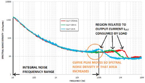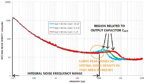 但是,如何表示LDO輸出的噪聲有多大呢?可用如上文所示的積分噪聲頻率范圍表示。這個范圍通常是10赫茲至100千赫。