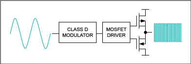 圖4. D類音頻放大器輸出開關波形,頻率遠高于需要復現的最高音頻信號頻率。由于輸出晶體管在工作期間要么完全導通,要么完全關閉,所以這些放大器的效率較高。