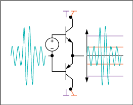 圖3. AB類放大器將兩個晶體管偏置,使其在信號接近零時能夠導通。所以這類放大器的效率比A類放大器高,失真比B類放大器小。