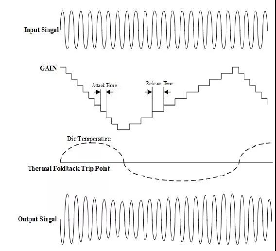 (1)隨著音樂的播放,當PA因環境溫度增高、音樂平均功率上升引起溫度累積而板級散熱不足時,PA結溫將逐漸升高,當結溫高于自動限溫點(Thermal Foldback Trip Point, TFB)時,PA將以啟動時間(Attack Time, tA) 的速率自動減小增益,以減小PA功率耗散從而降低結溫。