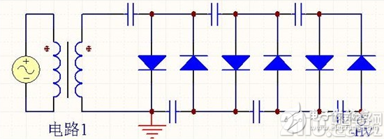 用于倍壓整流電路的二極管,其最高反向電壓應大于 。可用高壓硅整流堆,其系列型號為2DL。如2DL2/0.2,表示最高反向電壓為2千伏,整流電流平均值為200毫安。倍壓整流電路使用的電容器容量比較小,不用電解電容器。電容器的耐壓值要大于1.5x ,在使用上才安全可靠。 |