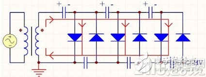 當變壓器次級輸出為上正下負時,電流流向如圖所示。變壓器向上臂三個電容充電儲能。