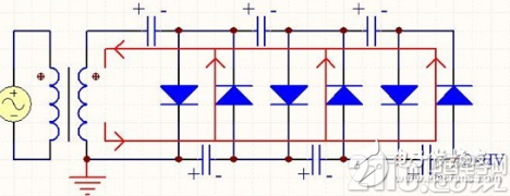 優點是每個電容上的電壓不會超過變壓器次級峰值電壓U的兩倍,即2U,所以可以選用耐壓較低的電容。缺點是電容是串聯放電,紋波大。