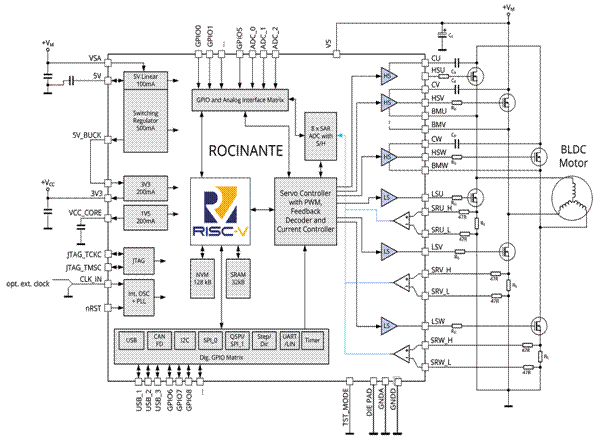 該組件也是世界上第一個在單一RISC-V中實現高壓技術的產品,可以實現能夠直接驅動N溝道的MOSFETs進而控制BLDC, 步進電機, 直流有刷電機以及音圈電機。