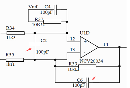 運放芯片本身對共模干擾有抵抗作用,而在差模干擾的抵抗作用稍弱,所以設(shè)計的時候要著重提高差分線上的差模抗干擾能力。如圖2所示,C2電容就是為了提高抗差模干擾能力。差分線上的電阻(R34、R35)和反饋電阻(R39)應(yīng)使用高精度的電阻,使得理論計算得到的參數(shù)是準(zhǔn)確可靠的。然后與運放的輸出連接的AD口引腳上并連一個RC電路濾掉高次諧波干擾和隨機脈沖干擾,從而提升抗干擾能力。