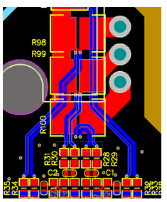 為了能夠準(zhǔn)確的采樣電流,應(yīng)將運放芯片在PCB上的位置盡量靠近采樣電阻,同時又要使運放芯片不能遠(yuǎn)離MCU,運放的地和MCU的地應(yīng)該盡量靠攏。如圖3所示,采樣電阻(R98、R99、R100)兩端走差分線到運放的同相和反相端口,差分線應(yīng)等距并且盡量短,以避免其他的干擾產(chǎn)生。壓縮機涉及到高壓和低壓部分,在布局電流地的時候,應(yīng)使大電流地和小電流地能很好的單點隔離。