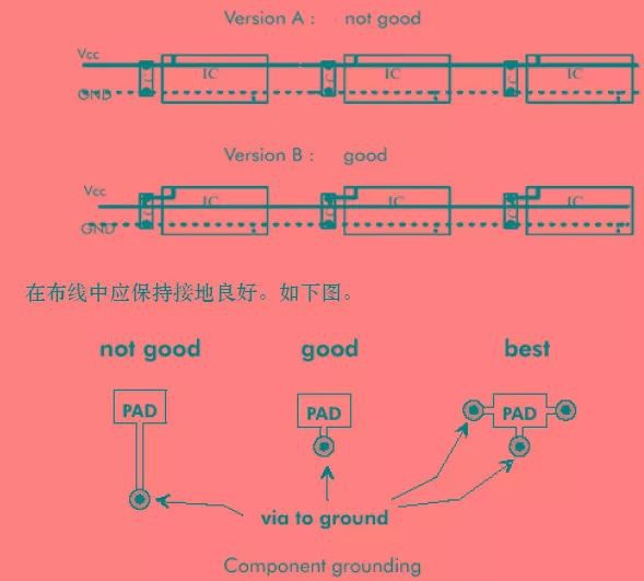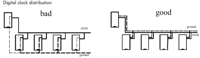 對應地線回路規(guī)則,實際上也是為了盡量減小信號的回路面積,多見于一些比較重要的信號,如時鐘信號,同步信號;對一些特別重要,頻率特別高的信號,應該考慮采用銅軸電纜屏蔽結構設計,即將所布的線上下左右用地線隔離,而且還要考慮好如何有效的讓屏蔽地與實際地平面有效結合。