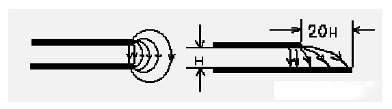 解決的辦法是將電源層內縮, 使得電場只在接地層的范圍內傳導。 以一個H(電源和地之間的介質厚度)為單位,若內縮20H則可以將70%的電場限制在接地層邊沿內;內縮100H則可以將98%的電場限制在內。