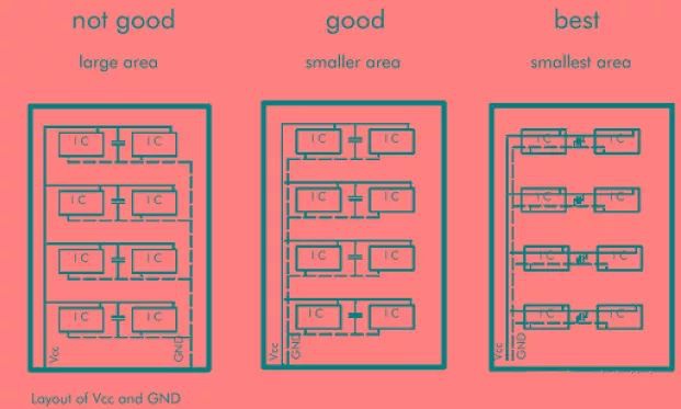 環(huán)路最小規(guī)則,即信號線與其回路構成的環(huán)面積要盡可能小,環(huán)面積越小,對外的輻射越少,接收外界的干擾也越小。