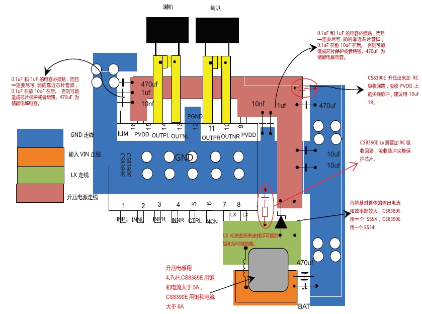 A、 電感應該盡可能靠近芯片,以縮短 LX 到電感的走線距離。LX走線盡可能短粗,有利于性能,效率EMI的提升。如果EMI有問題,可以在靠近 LX的地方加入 RC 吸波 電路,具體的取值可以和我司聯系。CS8389E電感選用4.7uH@5A 飽和高頻功率電感,CS8390E電感選用4.7uH@6A飽和高頻功率電感。
