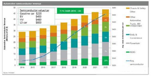 據HIS Markit的預測,2016-2022年車載半導體的市場增長率是年平均7.1%,車載MCU的統合在穩步發展,傳感器組合在多樣化地增長。